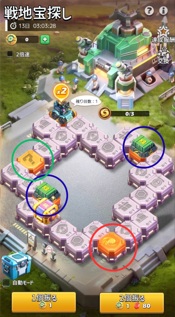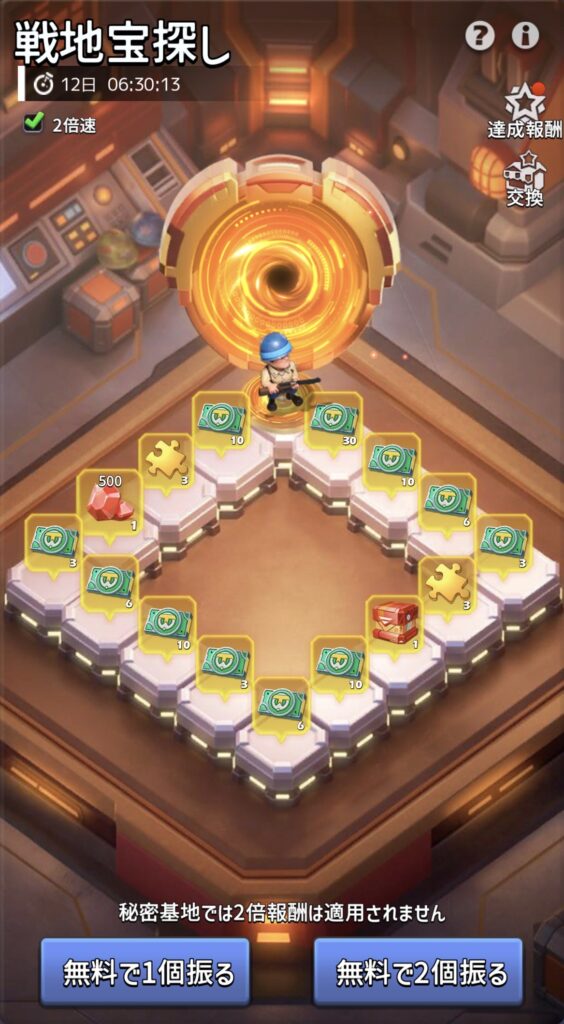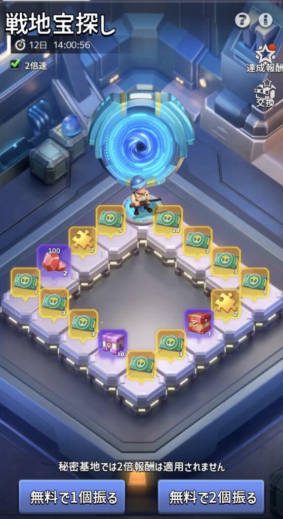 赤丸のマスは転送ゲートです。転送ゲートに止まると、秘密基地に移動します。秘密基地では、「無料で1個振る」か「無料で2個振る」を選択してサイコロを振ることができます。転送ゲートのマスか、既に報酬を獲得したマスに止まるまでは、何度もサイコロを振って報酬を獲得できます。(転送ゲートのマスか、既に報酬を獲得したマスに止まると、元の戦地宝探し画面に戻ります。)