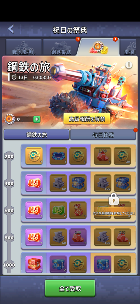 毎日任務と目標任務を達成することで獲得できる、鉄鋼部品の累計により報酬を獲得できます。