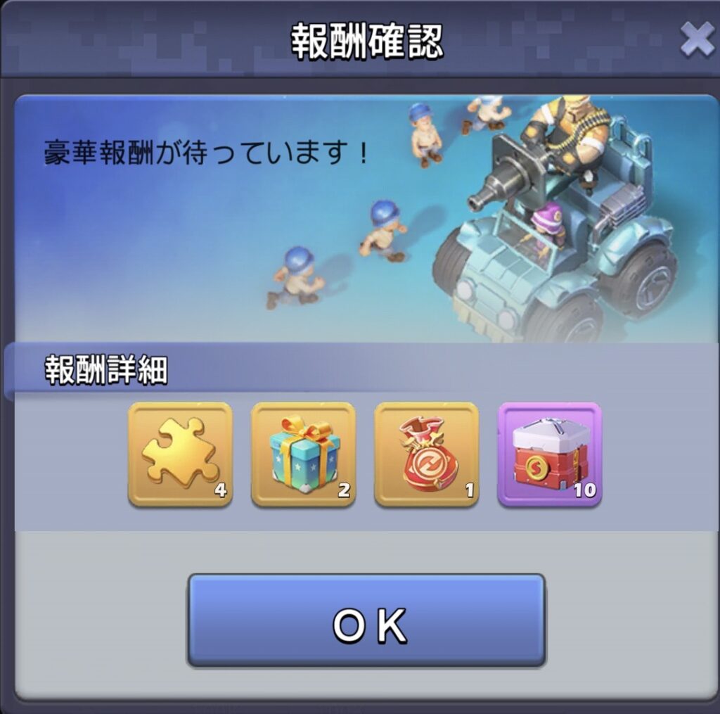 専用スキル万能破片×1 レアスキル宝箱×1 小体力剤×1 金貨バンバン宝箱×3 訓練加速8時間×1 食料100K×2 石油100K×2 |